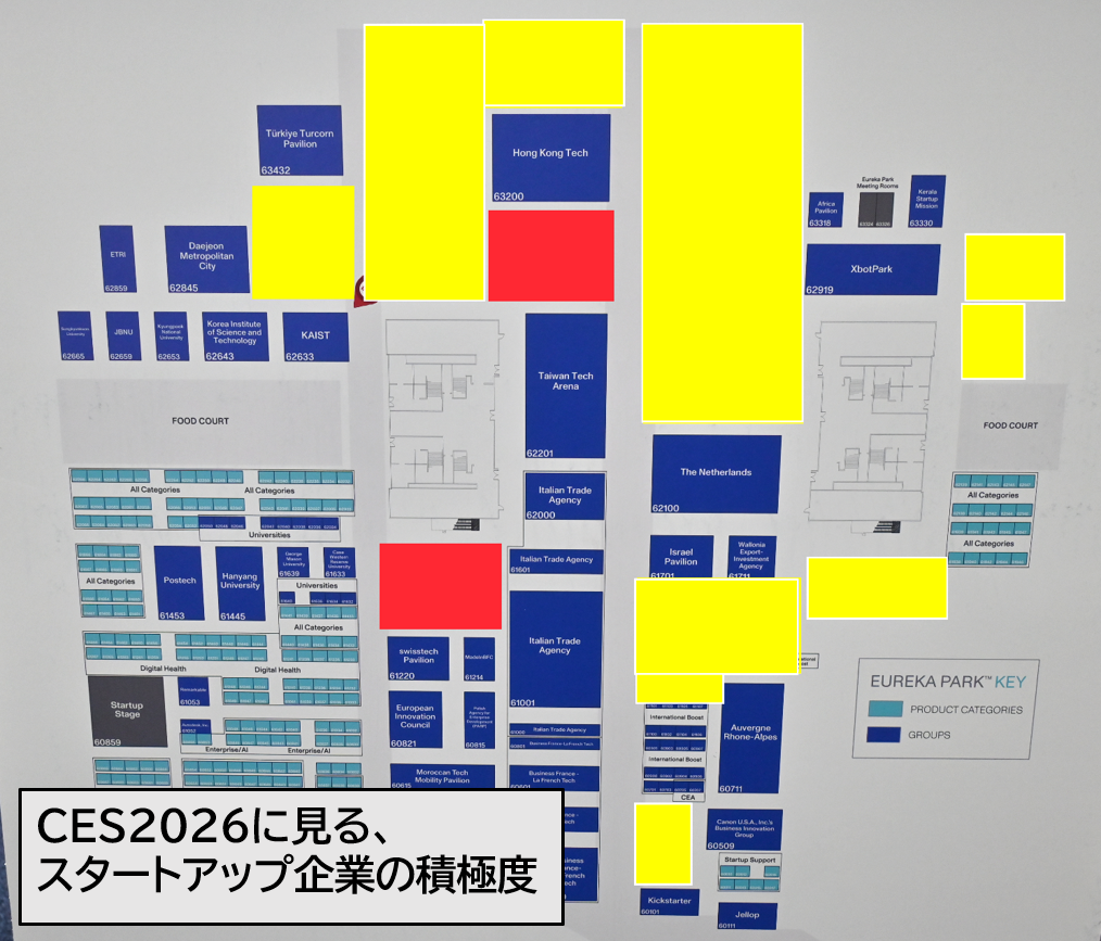 さて、この地図で皆さんが気になるところはおそらく黄色で示された場所でしょう。日本の2つのブースを合わせた面積の10倍まではいかないまでも、数倍の広さを誇っています。もったいぶらずに言うと、これら黄色で塗ったブースは、韓国企業です。「何かのキャンペーンで来ているのでは?」と思われるかもしれませんが、ユーレカパークでの韓国企業の数はここ数年こんな広さの規模を持っています。正確に数えたことはありませんが、毎年日本とはこれぐらいの差をつけて出展している、とい印象です。韓国と日本では人の数の差がありますので、それを考えれば日本の出展数の方が多くて当然なのですが、実際には出店数に大きな乖離がある、という状況なわけです。